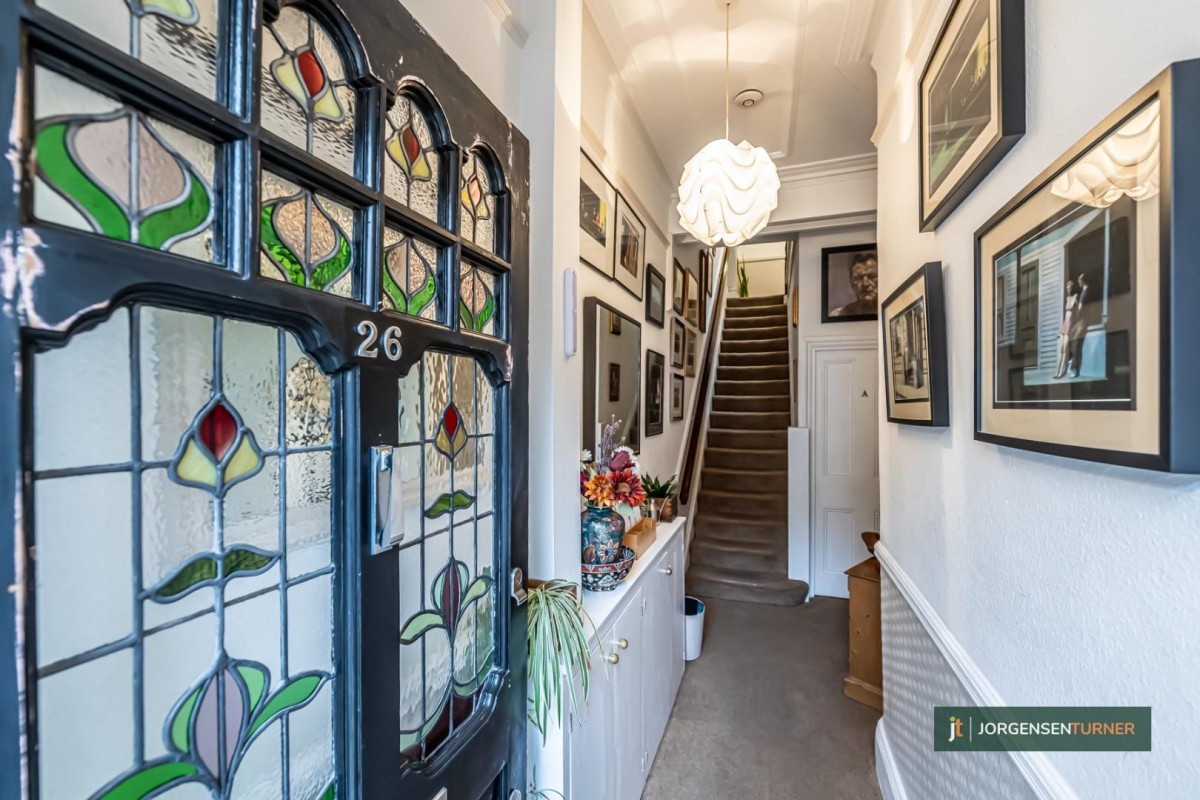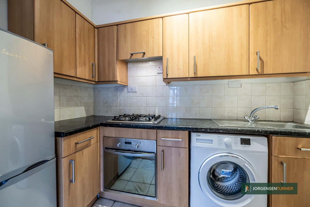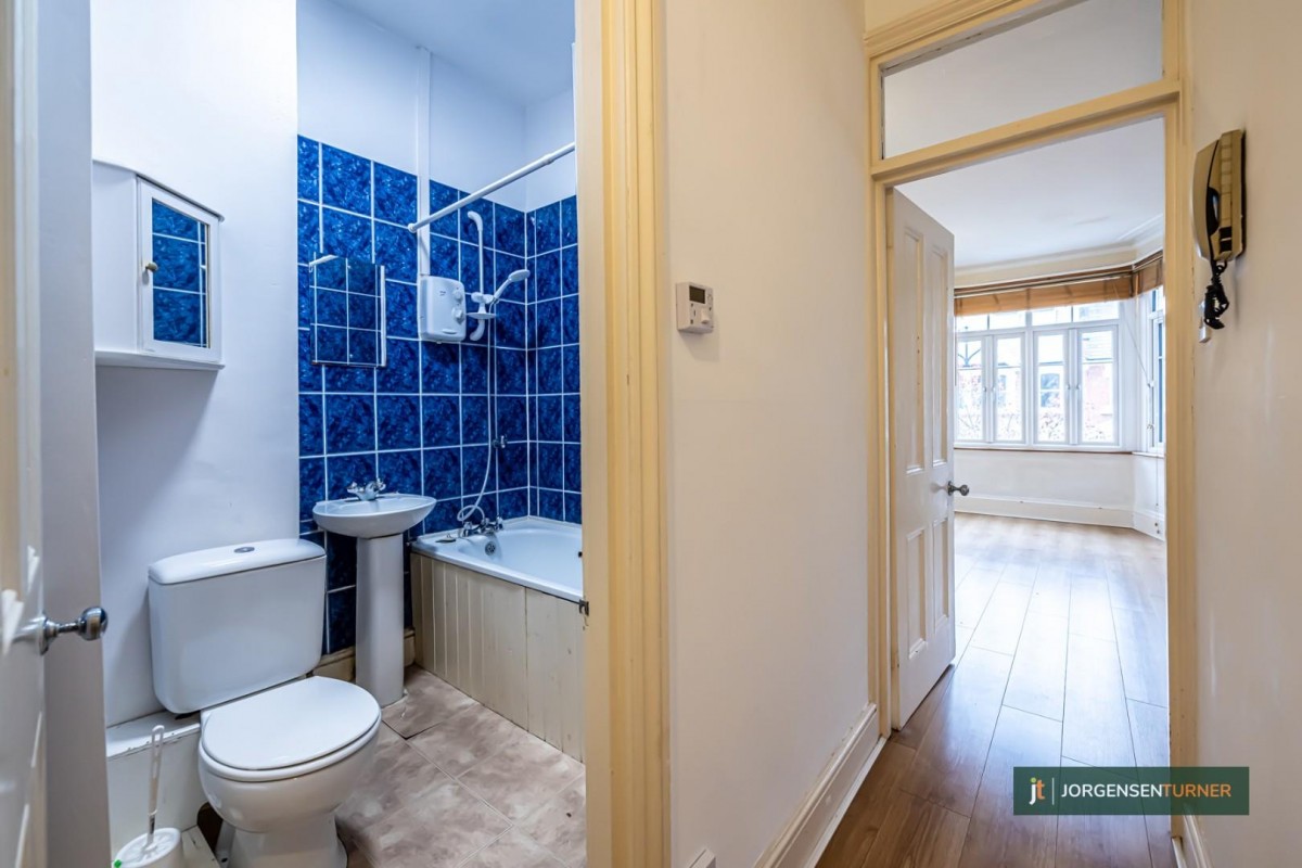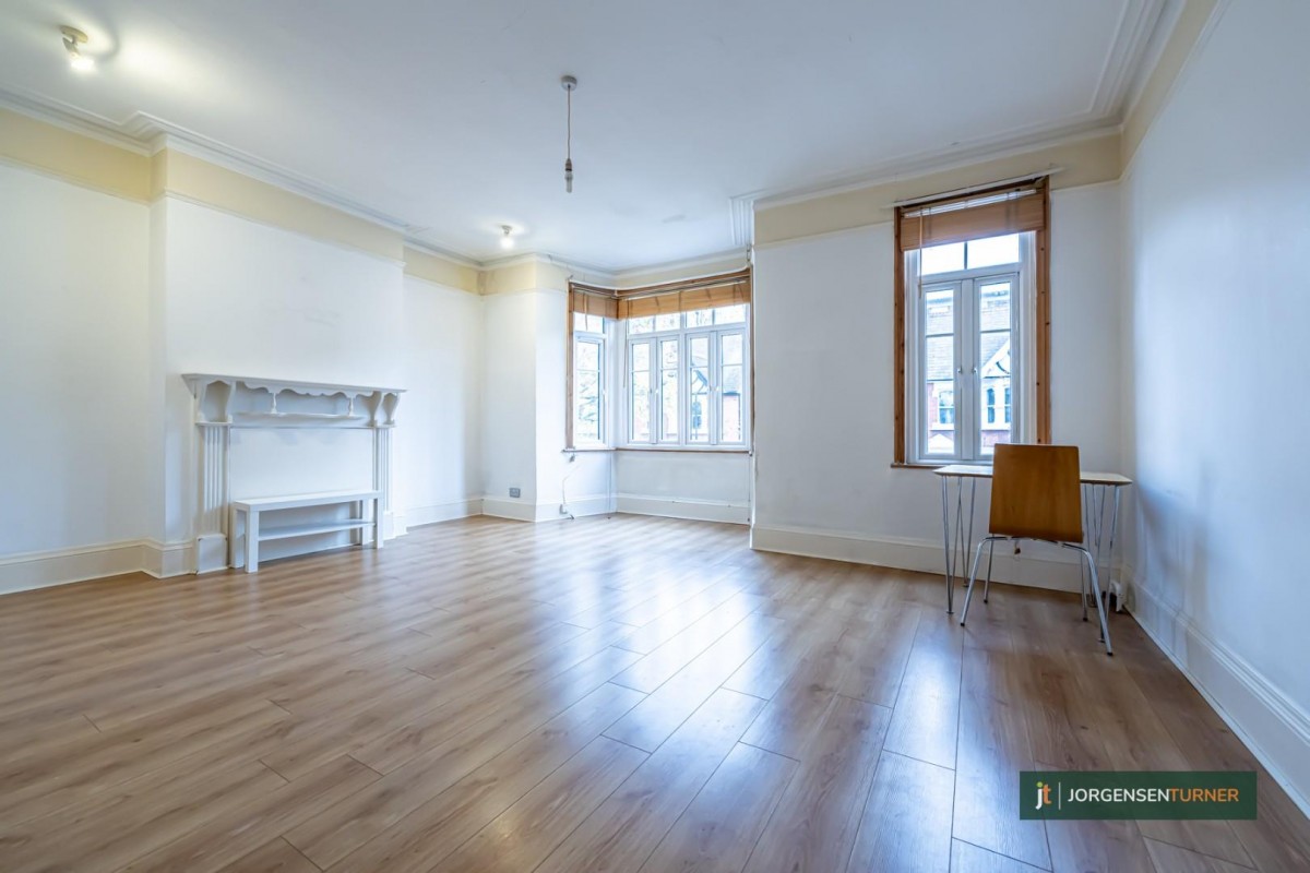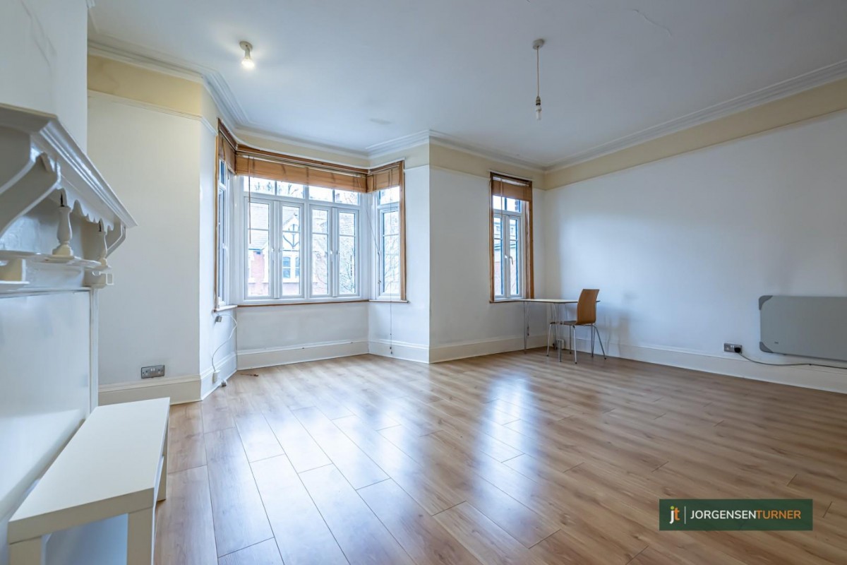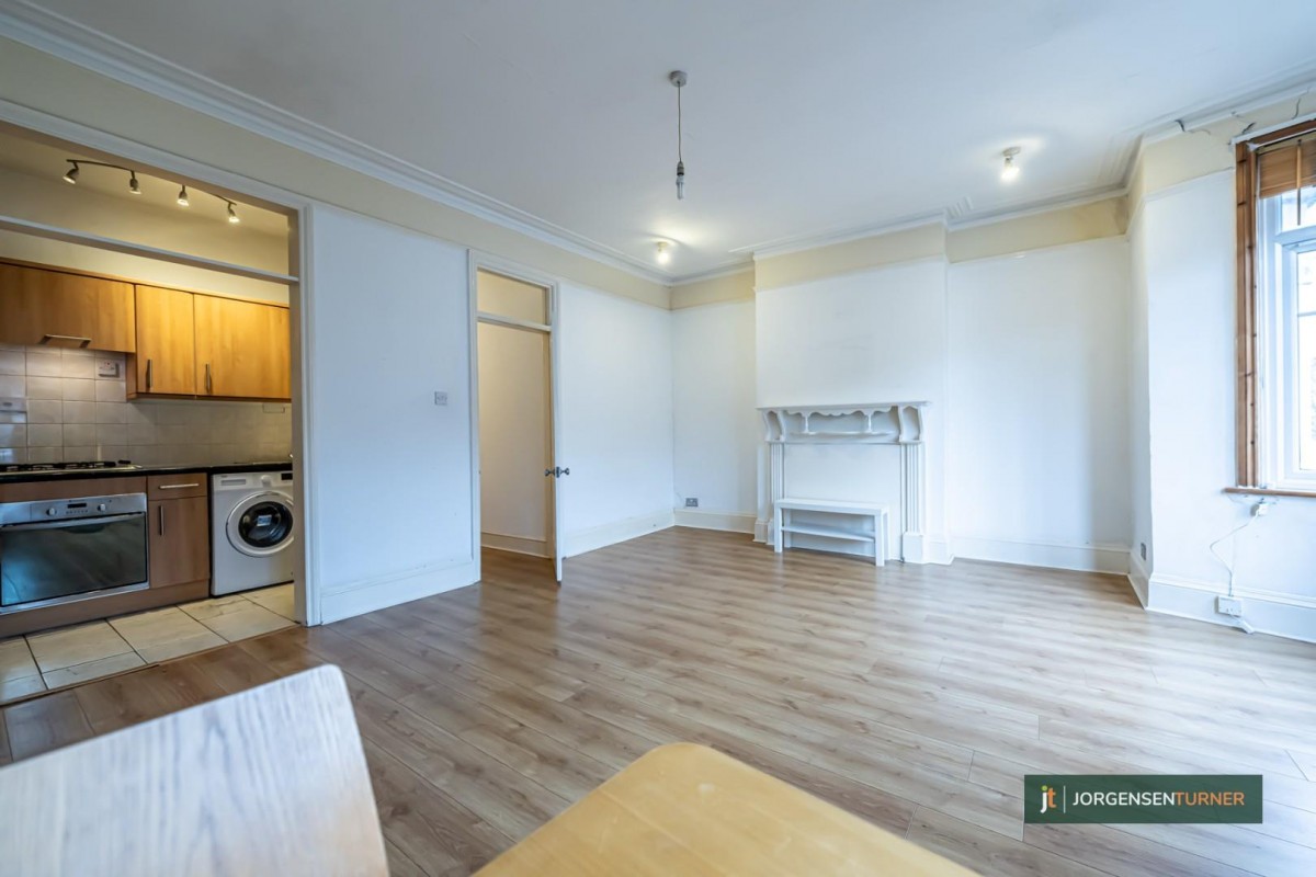 Expansive First-Floor Studio with Unique Charm in a Coveted Locale. We at Jorgensen Turner are thrilled to present this notably spacious first-floor studio apartment, exuding a unique blend of volume and comfort. The property provides a generous layout, inclusive of a semi open-plan, eat-in kitchen and a vast bedroom/living area, distinguished by its remarkably high ceilings.