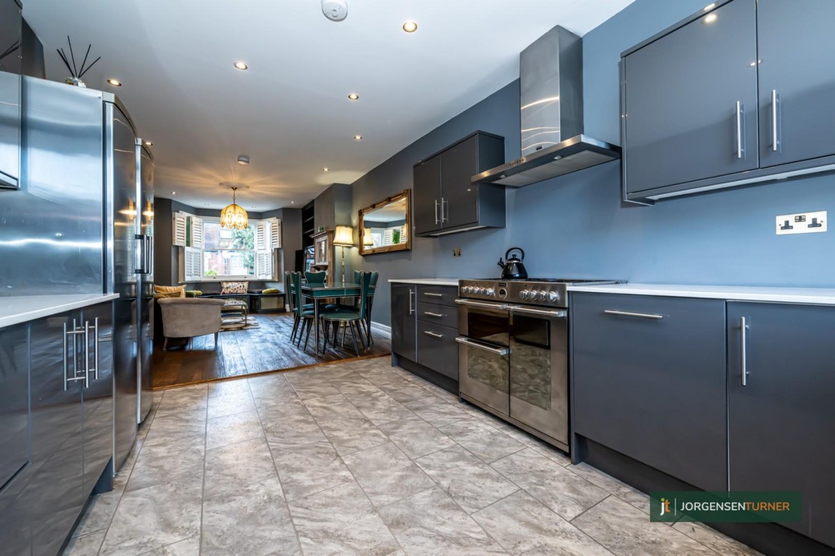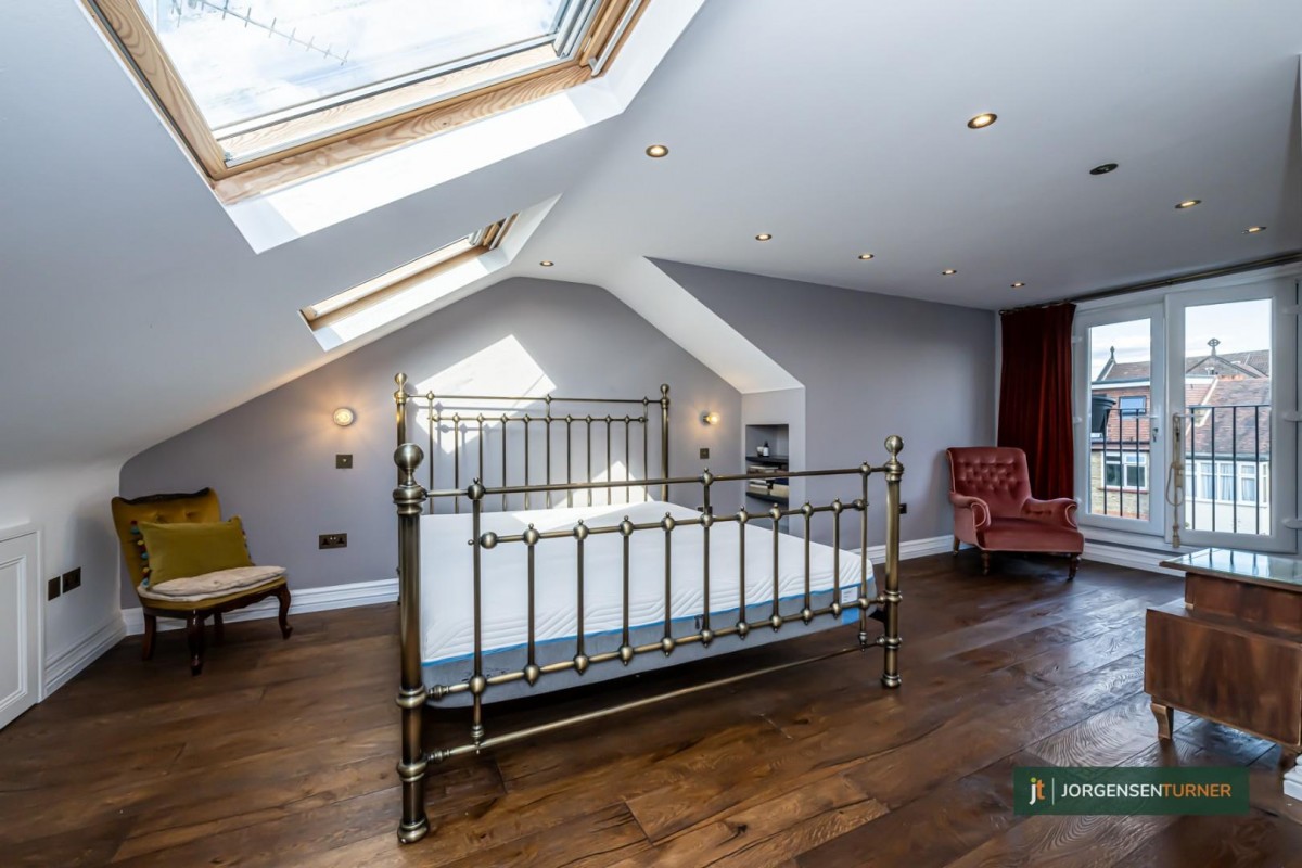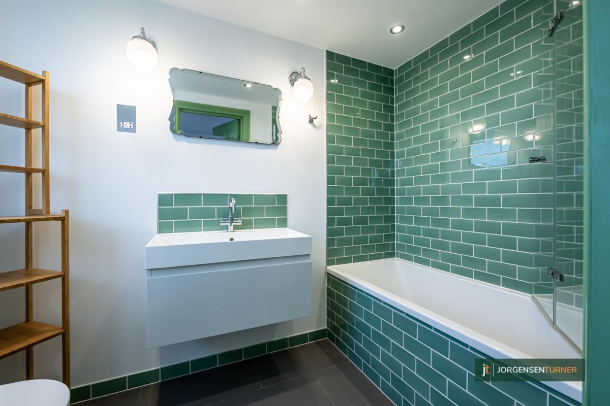 At the heart of this home is its open-plan living area, featuring high ceilings and a restored fireplace, perfect for cosy evenings or entertaining guests. The sleek, modern, open-plan kitchen, equipped with high-gloss cabinetry and stainless steel appliances, offers ample counter space and flows effortlessly into the dining area, creating an ideal space for both casual nights in or dinner with guests. The loft-style master bedroom, with vaulted ceilings and skylights, adds a luxurious feel, while the bold green-tiled bathrooms, featuring walk-in showers and chrome fixtures, ensure both style and convenience.