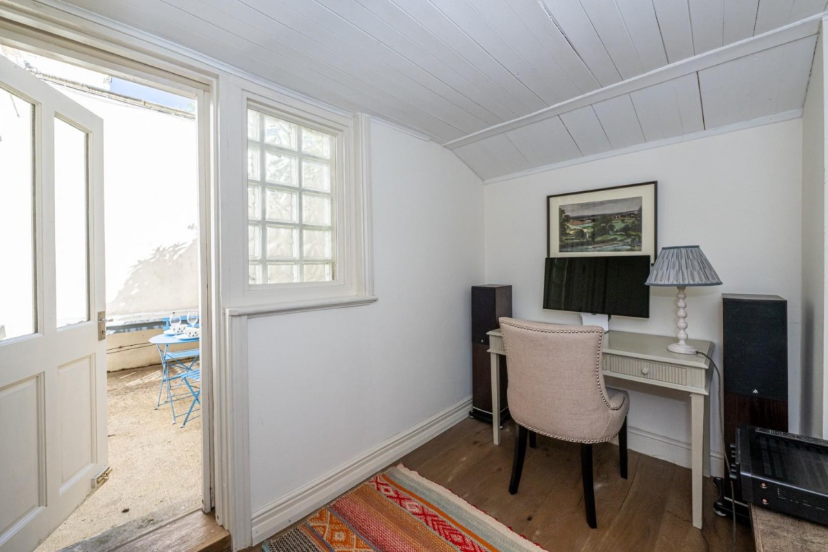Upon entering, you are welcomed by a wonderful living space that invites natural light, creating a warm and welcoming atmosphere. The property features two double bedrooms, each providing ample space for relaxation and privacy and a separate study room with direct access onto a large patio. With a well-appointed bathroom, morning routines and evening unwinding are made effortless.