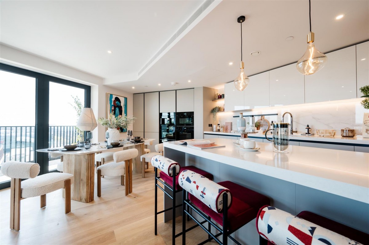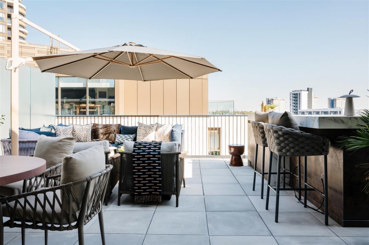 There's access to a rooftop beach club with panoramic views across London, cinema facilities, gym and entertainment suite. There's 24 hr concierge.